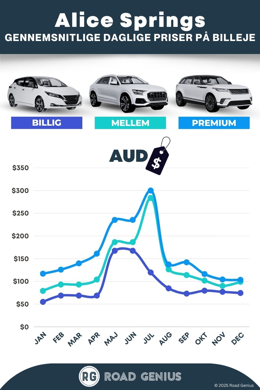 I gennemsnit koster billeje i Alice Springs omkring AUD 116 pr. dag, mens de billigste udlejninger fås fra AUD 69 pr. dag.