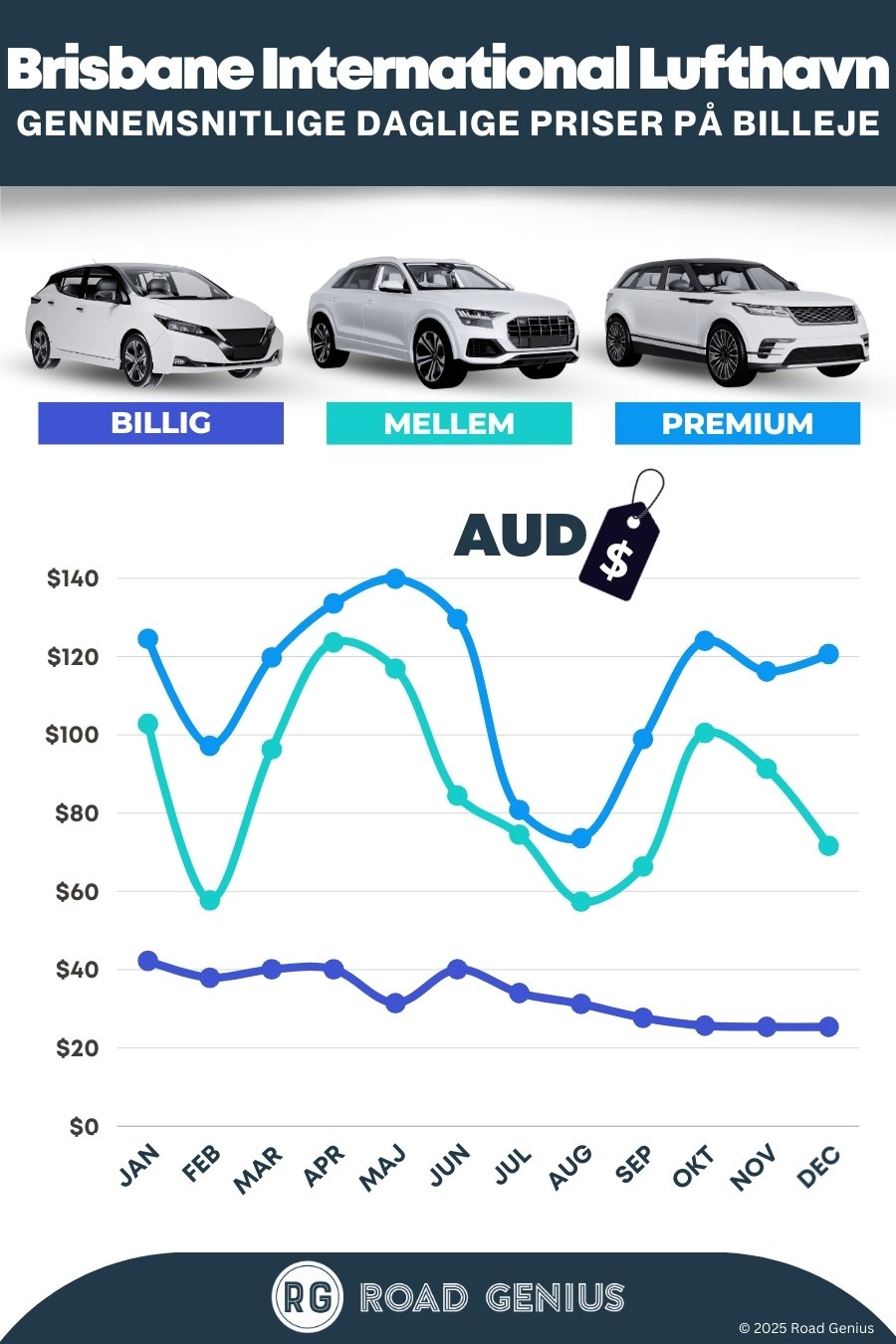 I gennemsnit koster billeje i Brisbane Lufthavn (BNE) omkring AUD 103 pr. dag, mens de billigste udlejninger fås fra AUD 25 pr. dag.