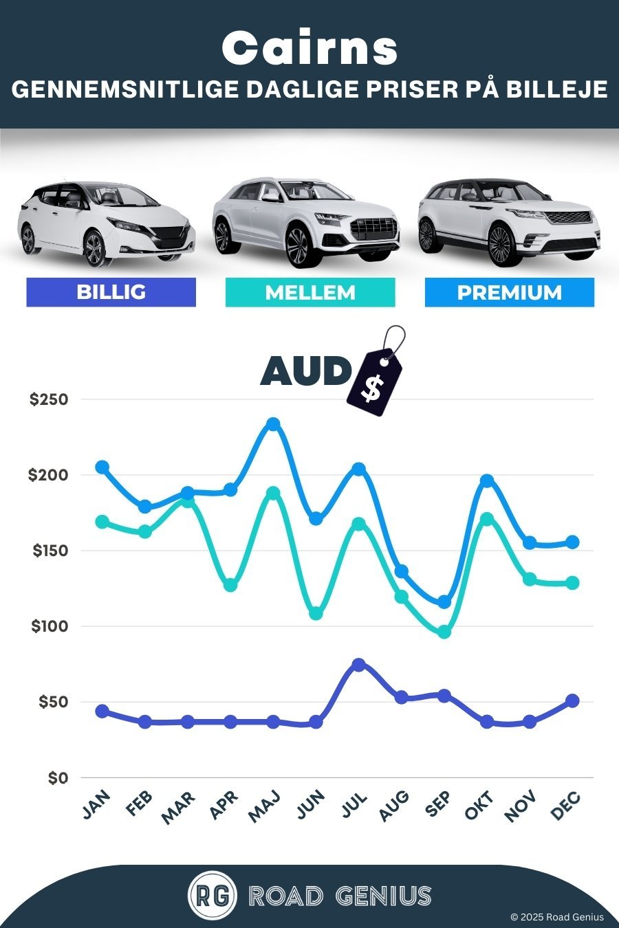 I gennemsnit koster billeje i Cairns omkring AUD 157 pr. dag, mens de billigste udlejninger fås fra AUD 37 pr. dag.
