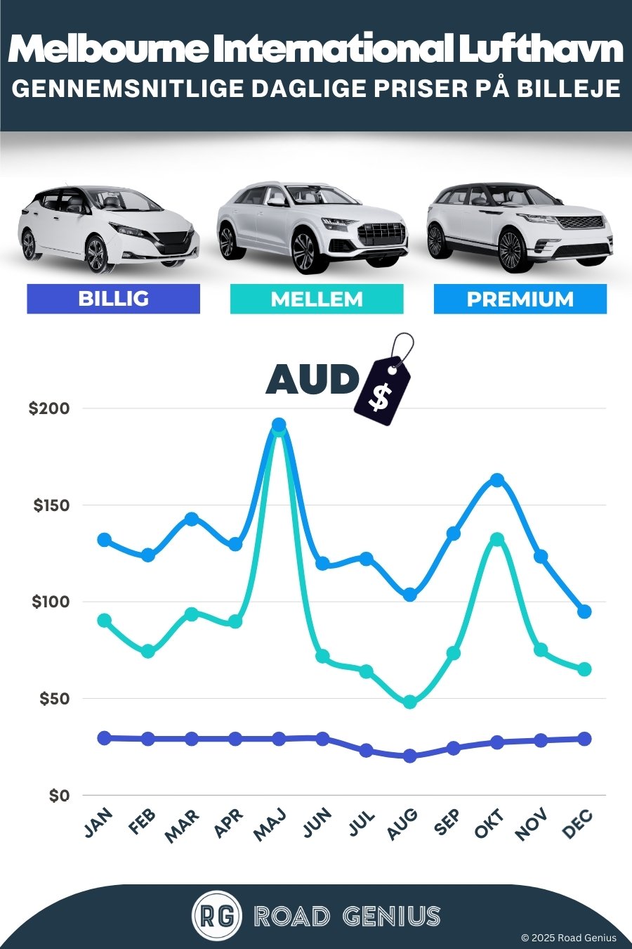 I gennemsnit koster billeje i Melbourne Lufthavn (MEL) omkring AUD 111 pr. dag, mens de billigste udlejninger fås fra AUD 20 pr. dag.