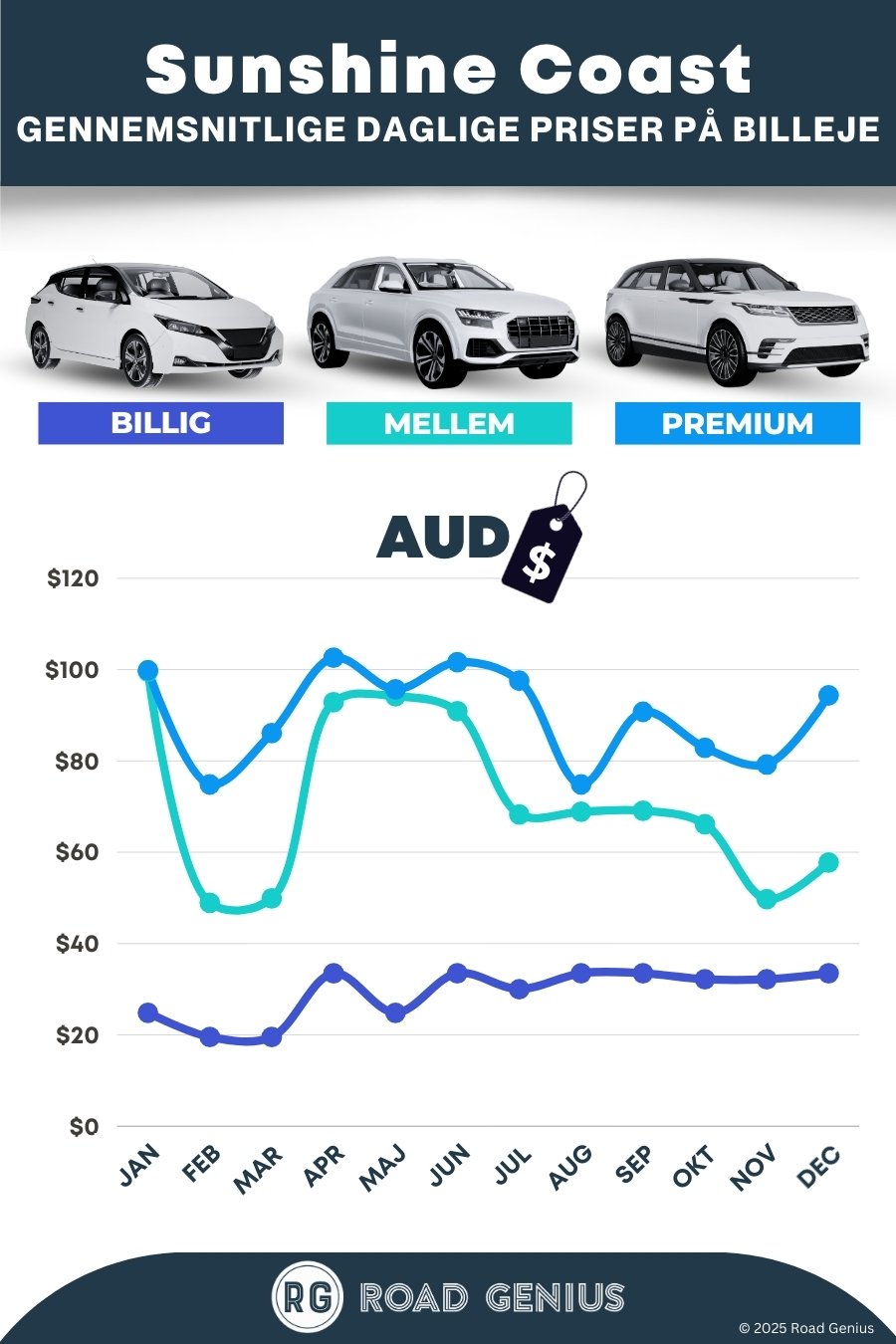 I gennemsnit koster billeje på Sunshine Coast omkring AUD 79 pr. dag, mens de billigste udlejninger fås fra AUD 20 pr. dag.