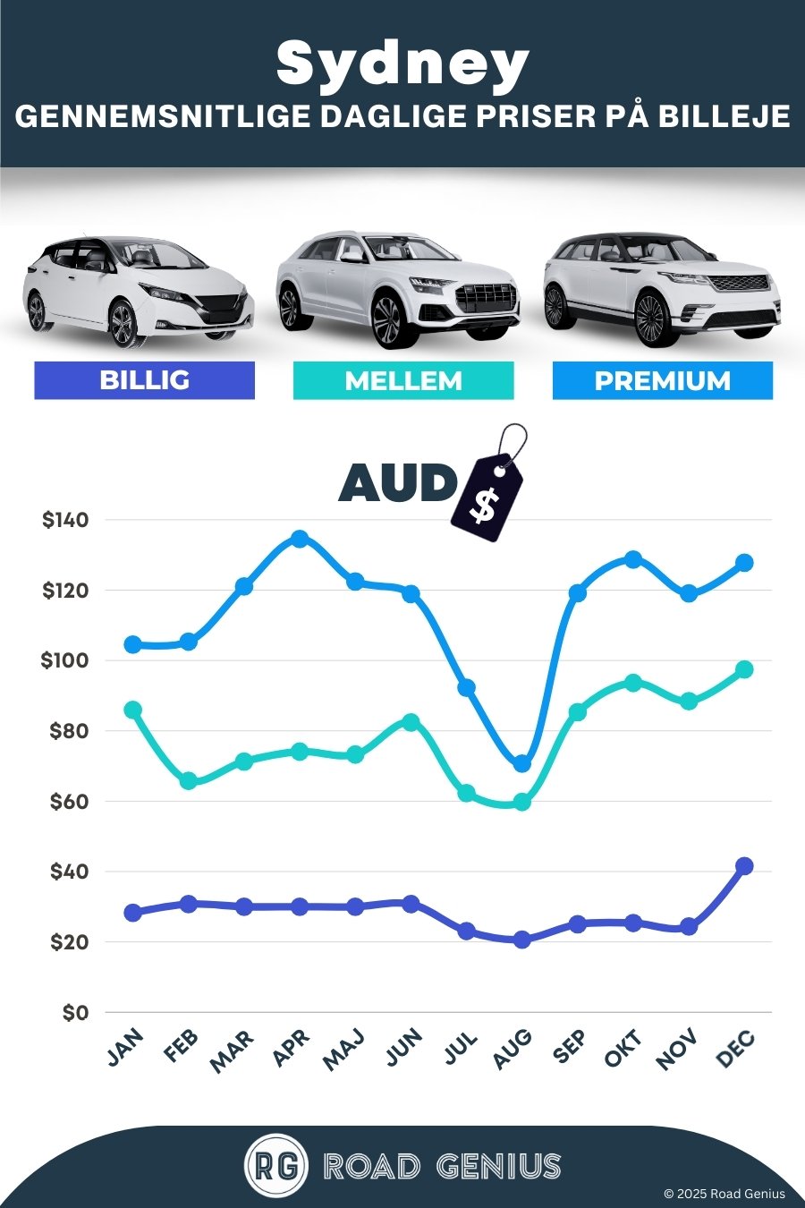 I gennemsnit koster billeje i Sydney omkring AUD 97 pr. dag, mens de billigste udlejninger fås fra AUD 21 pr. dag.
