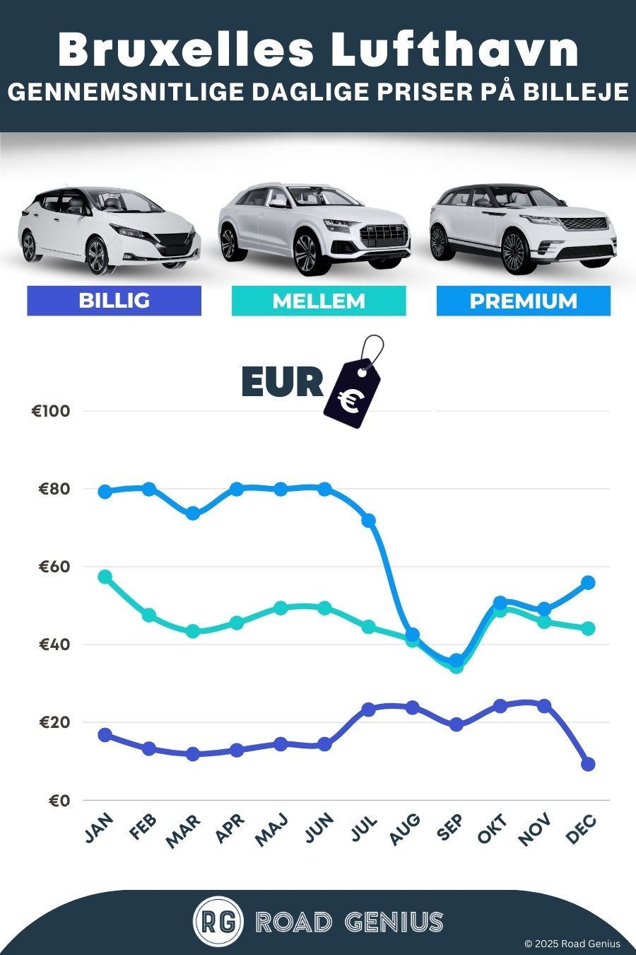 I gennemsnit koster billeje i Bruxelles Lufthavn omkring 43 € pr. dag, og de billigste lejebiler fås fra 9 € pr. dag.