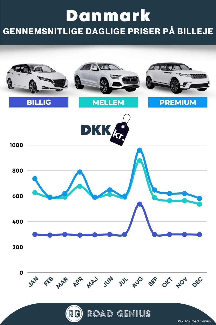 I gennemsnit koster billeje i Danmark omkring 533 kr pr. dag, og de billigste lejebiler fås fra 294 kr pr. dag.