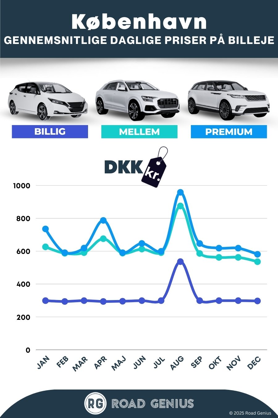 I gennemsnit koster billeje i Copenhagen omkring 533 kr. pr. dag, og de billigste lejebiler fås fra 294 kr. pr. dag.
