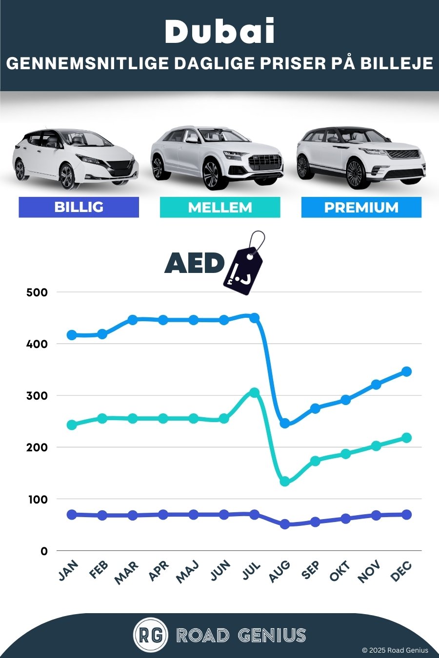 I gennemsnit koster billeje i Dubai omkring 224 AED pr. dag, og de billigste lejebiler fås fra 51 AED pr. dag.