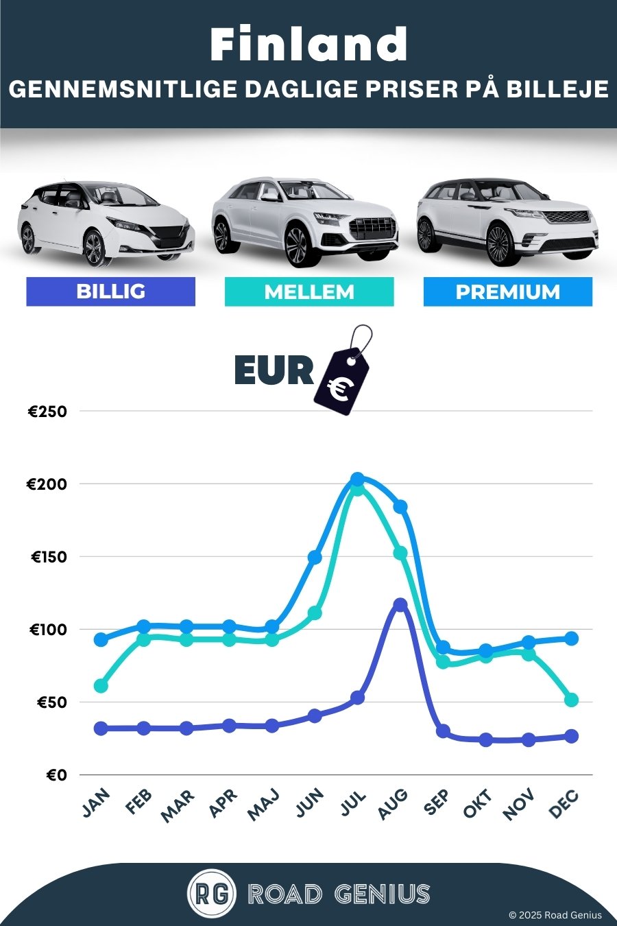 I gennemsnit koster billeje i Finland omkring 85 € pr. dag, og de billigste lejebiler fås fra 24 € pr. dag.