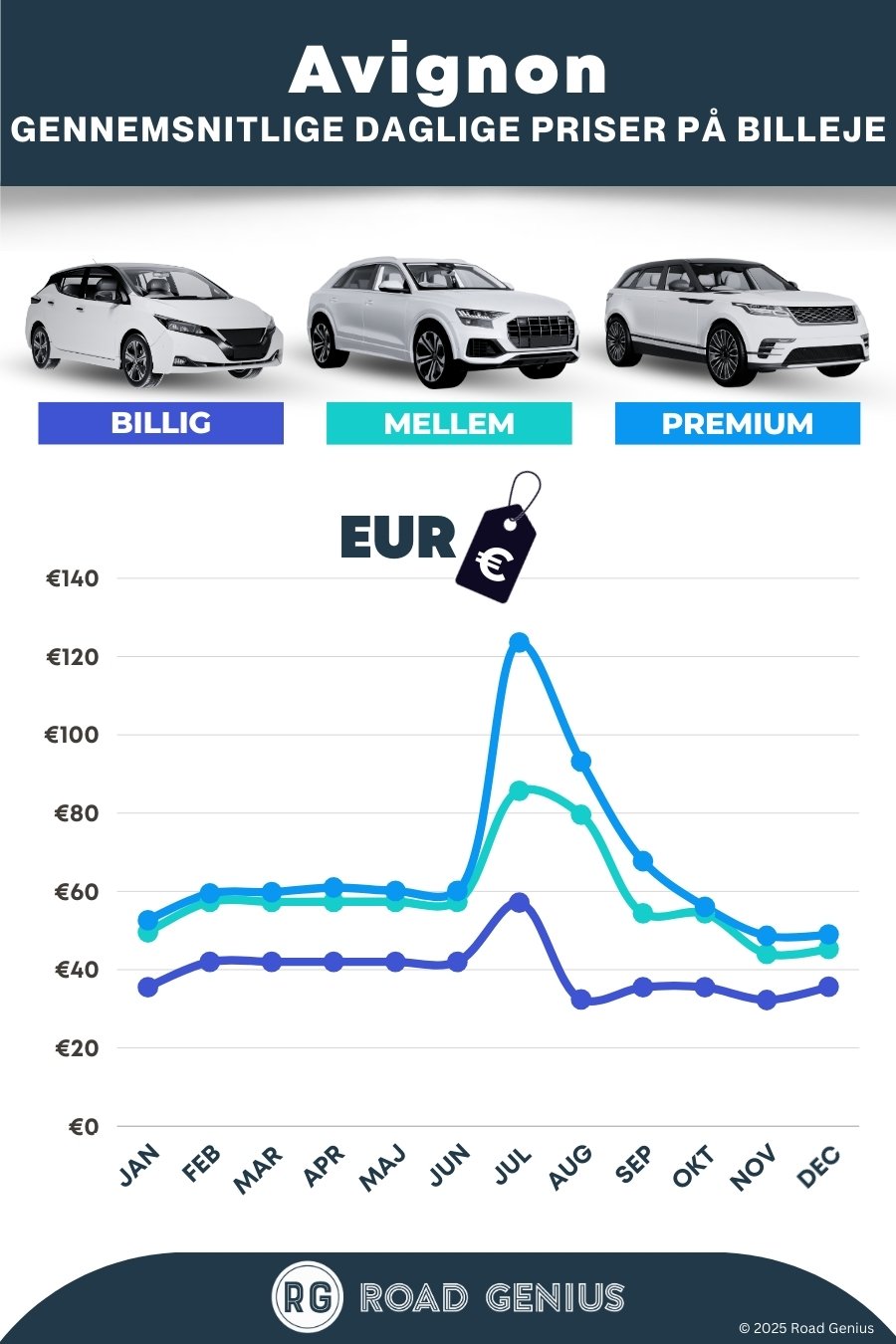 I gennemsnit koster billeje i Avignon omkring 55 € pr. dag, og de billigste lejebiler fås fra 32 € pr. dag.