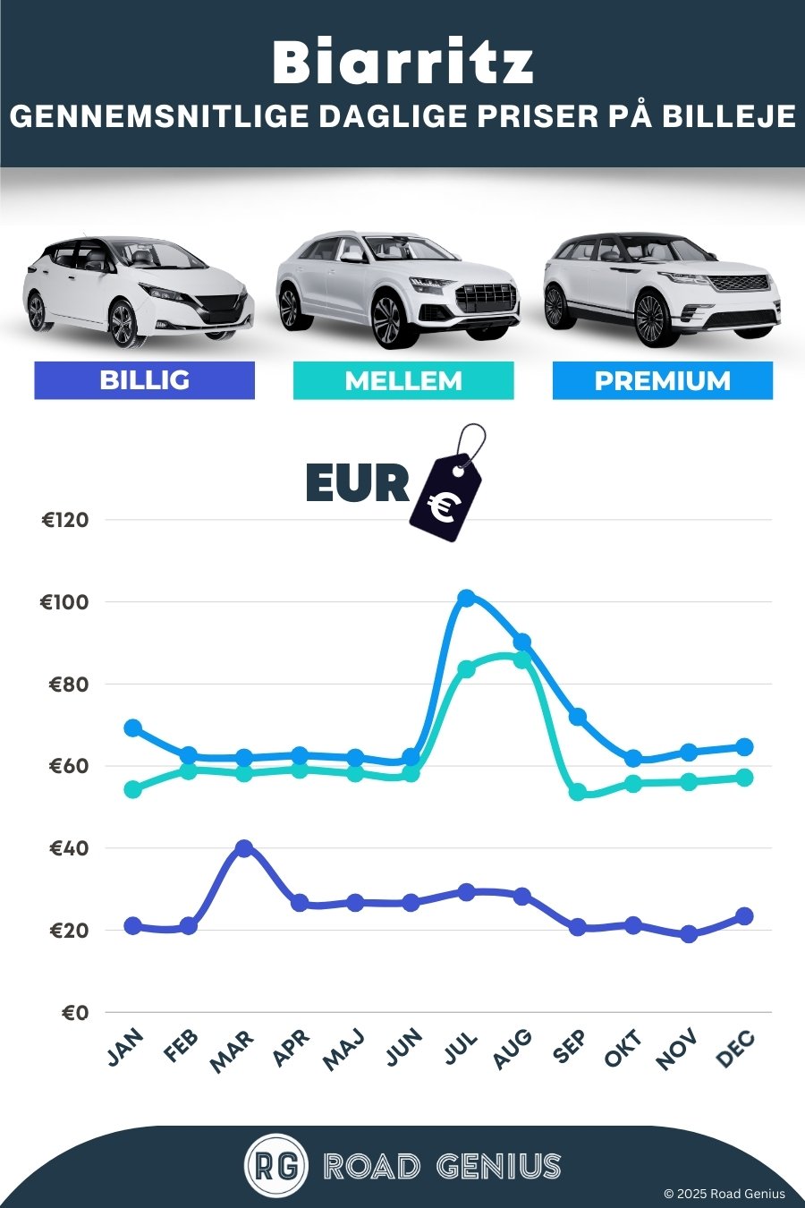 I gennemsnit koster billeje i Biarritz omkring 53 € pr. dag, og de billigste lejebiler fås fra 16 € pr. dag.