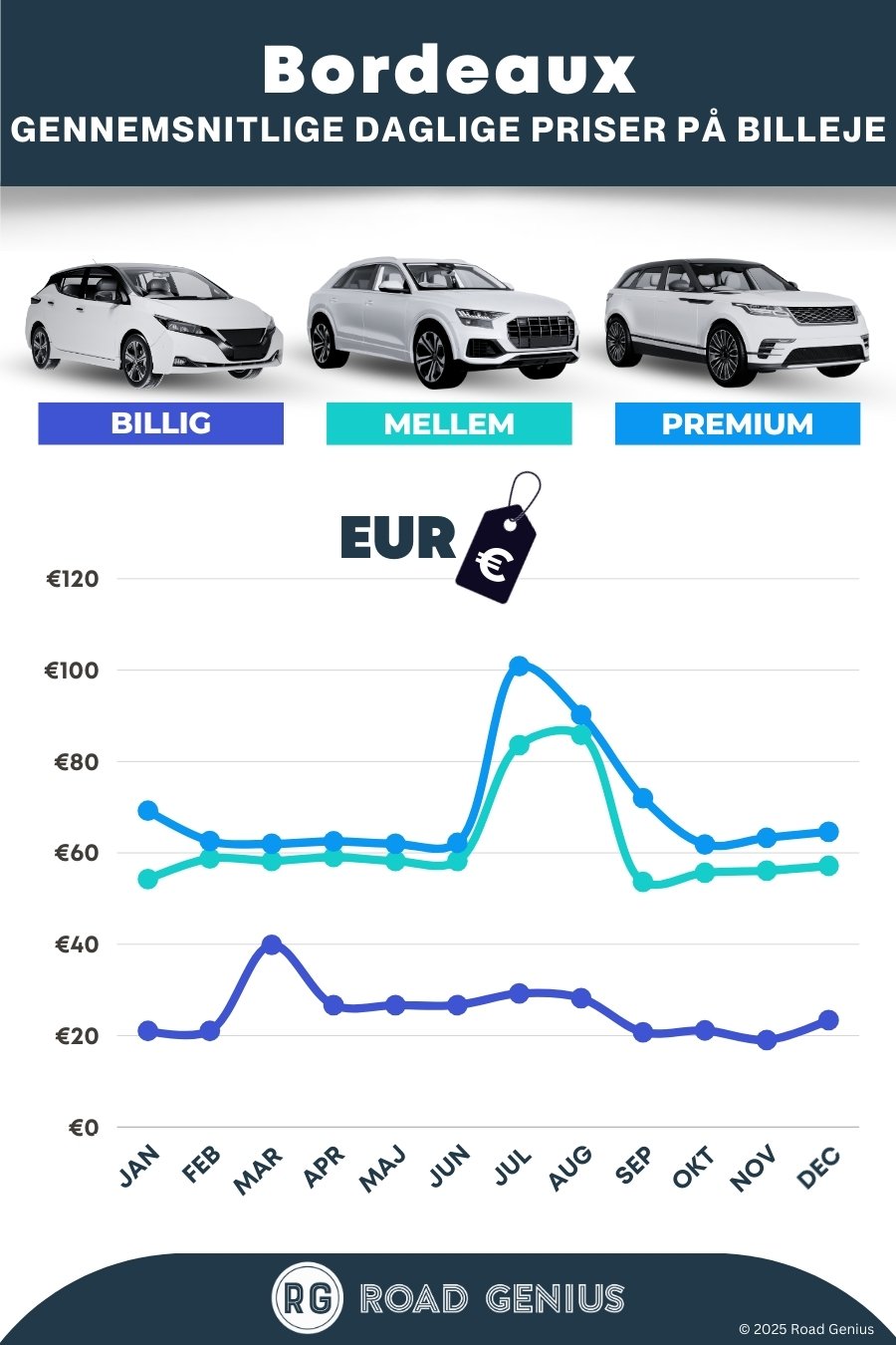 I gennemsnit koster billeje i Bordeaux omkring 52 € pr. dag, og de billigste lejebiler fås fra 19 € pr. dag.