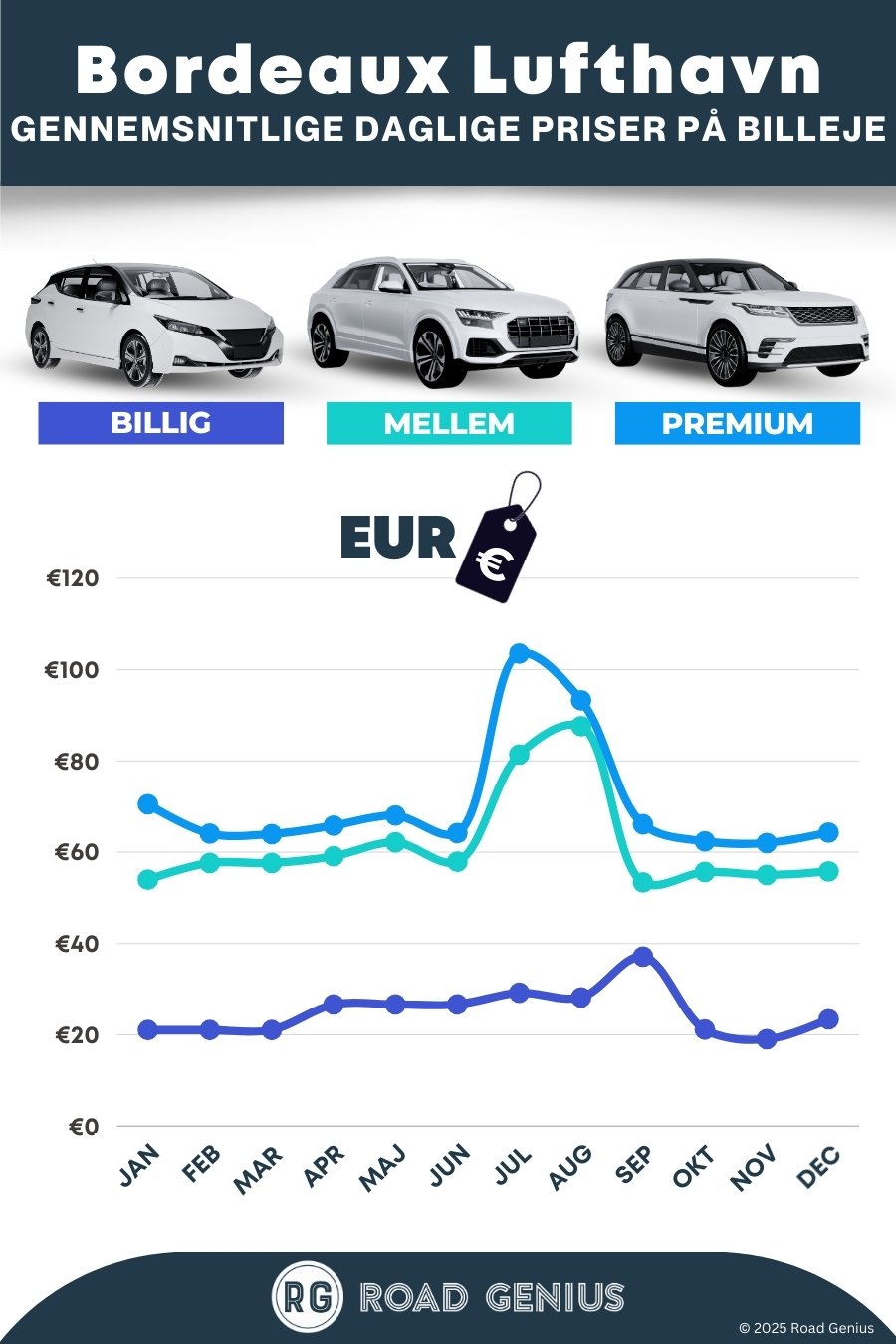 I gennemsnit koster billeje i Bordeaux Airport omkring 52 € pr. dag, og de billigste lejebiler fås fra 19 € pr. dag.