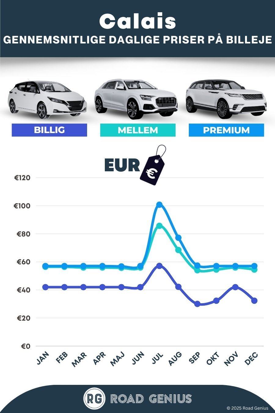 I gennemsnit koster billeje i Calais omkring 54 € pr. dag, og de billigste lejebiler fås fra 30 € pr. dag.
