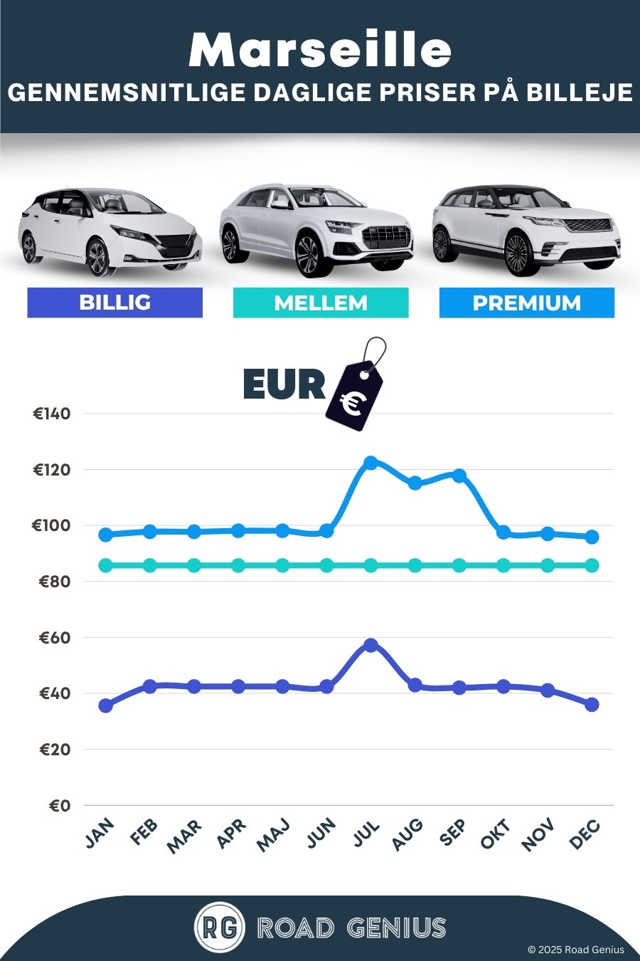 I gennemsnit koster billeje i Marseille omkring 77 € pr. dag, og de billigste lejebiler fås fra 36 € pr. dag.