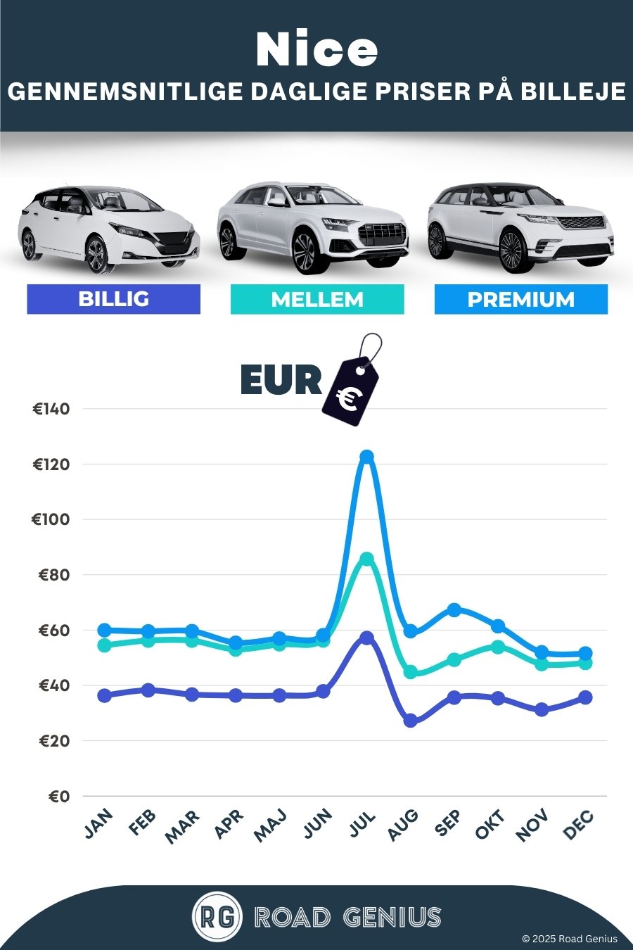 I gennemsnit koster billeje i Nice omkring 52 € pr. dag, og de billigste lejebiler fås fra 27 € pr. dag.