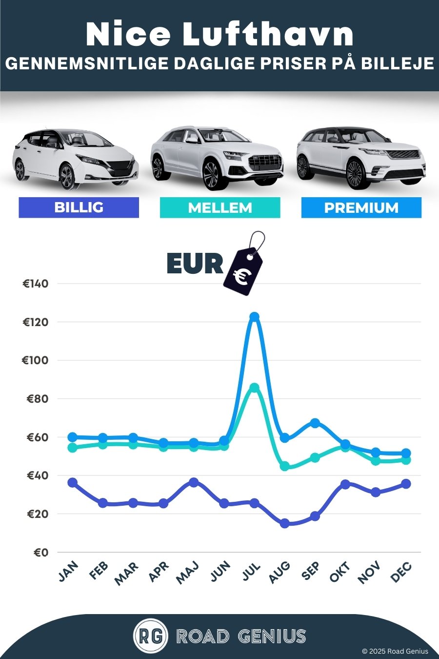 I gennemsnit koster billeje i Nice Airport omkring 49 € pr. dag, og de billigste lejebiler fås fra 15 € pr. dag.