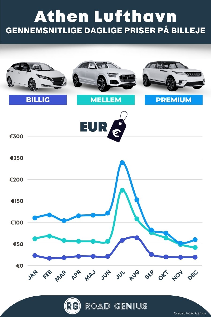 I gennemsnit koster billeje i Athen Lufthavn omkring 71 € pr. dag, og de billigste lejebiler fås fra 17 € pr. dag.