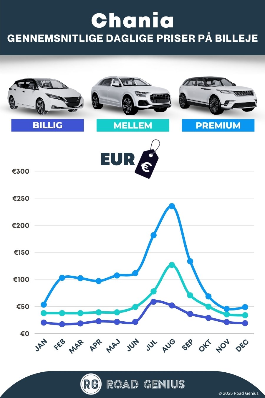I gennemsnit koster billeje i Chania omkring 63 € pr. dag, og de billigste lejebiler fås fra 17 € pr. dag.
