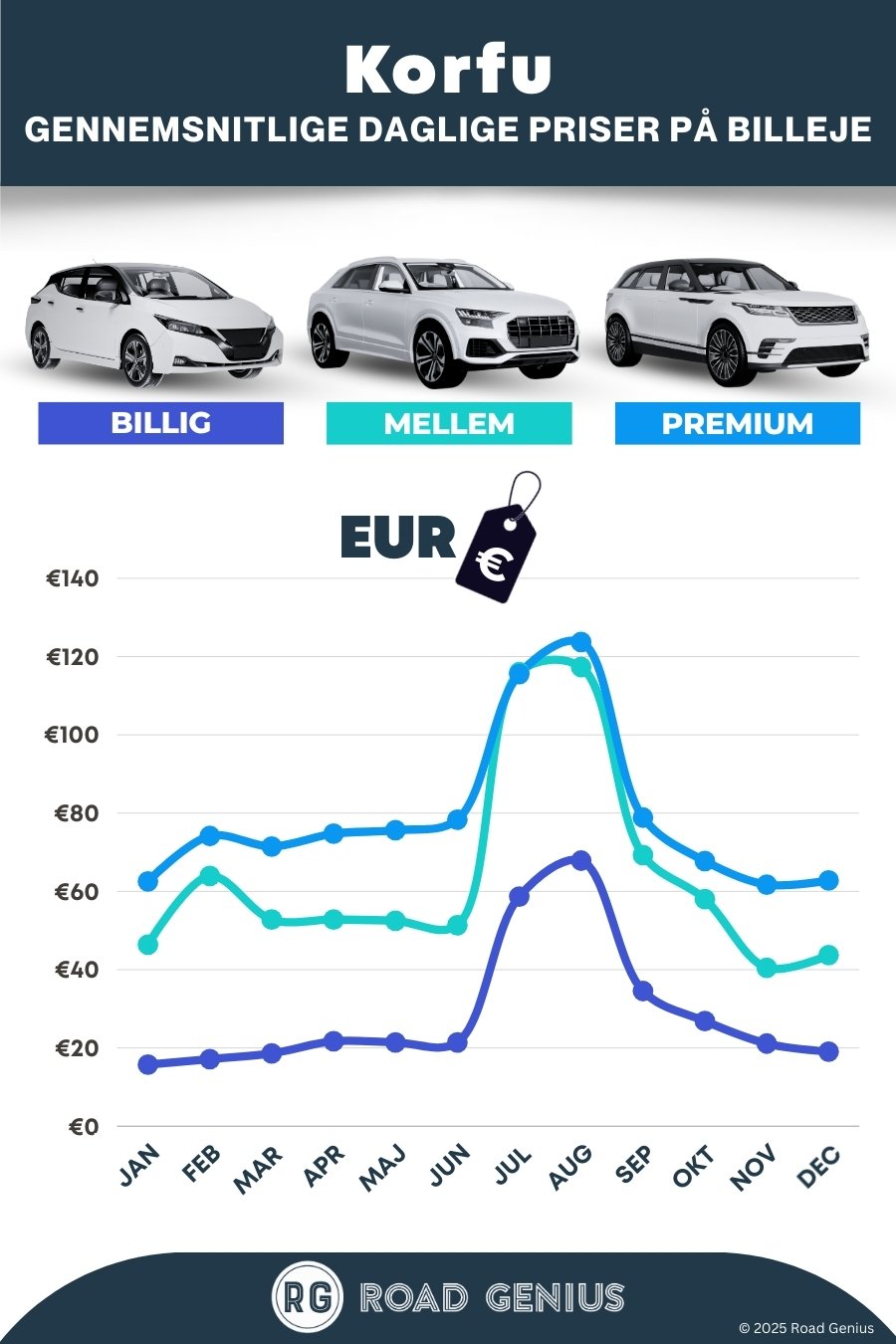 I gennemsnit koster billeje i Corfu omkring 57 € pr. dag, og de billigste lejebiler fås fra 16 € pr. dag.
