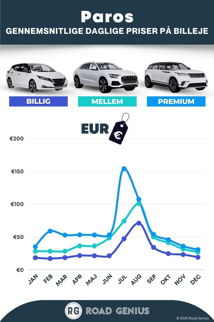 I gennemsnit koster billeje i Paros omkring 45 € pr. dag, og de billigste lejebiler fås fra 17 € pr. dag.