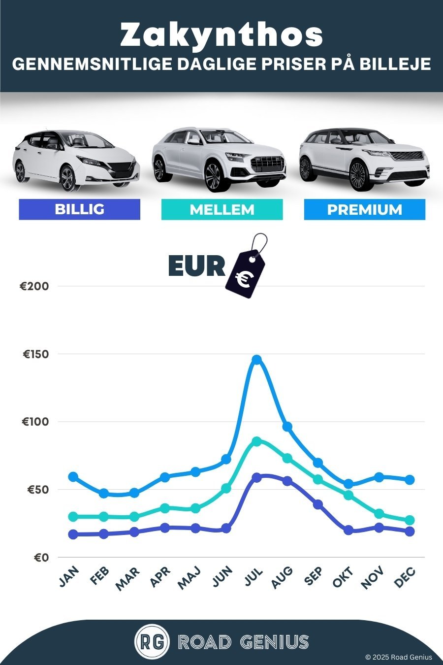 I gennemsnit koster billeje i Zakynthos omkring 47 € pr. dag, og de billigste lejebiler fås fra 17 € pr. dag.