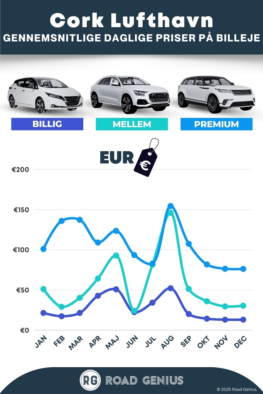 I gennemsnit koster billeje i Cork Airport omkring 63 € pr. dag, og de billigste lejebiler fås fra 13 € pr. dag.