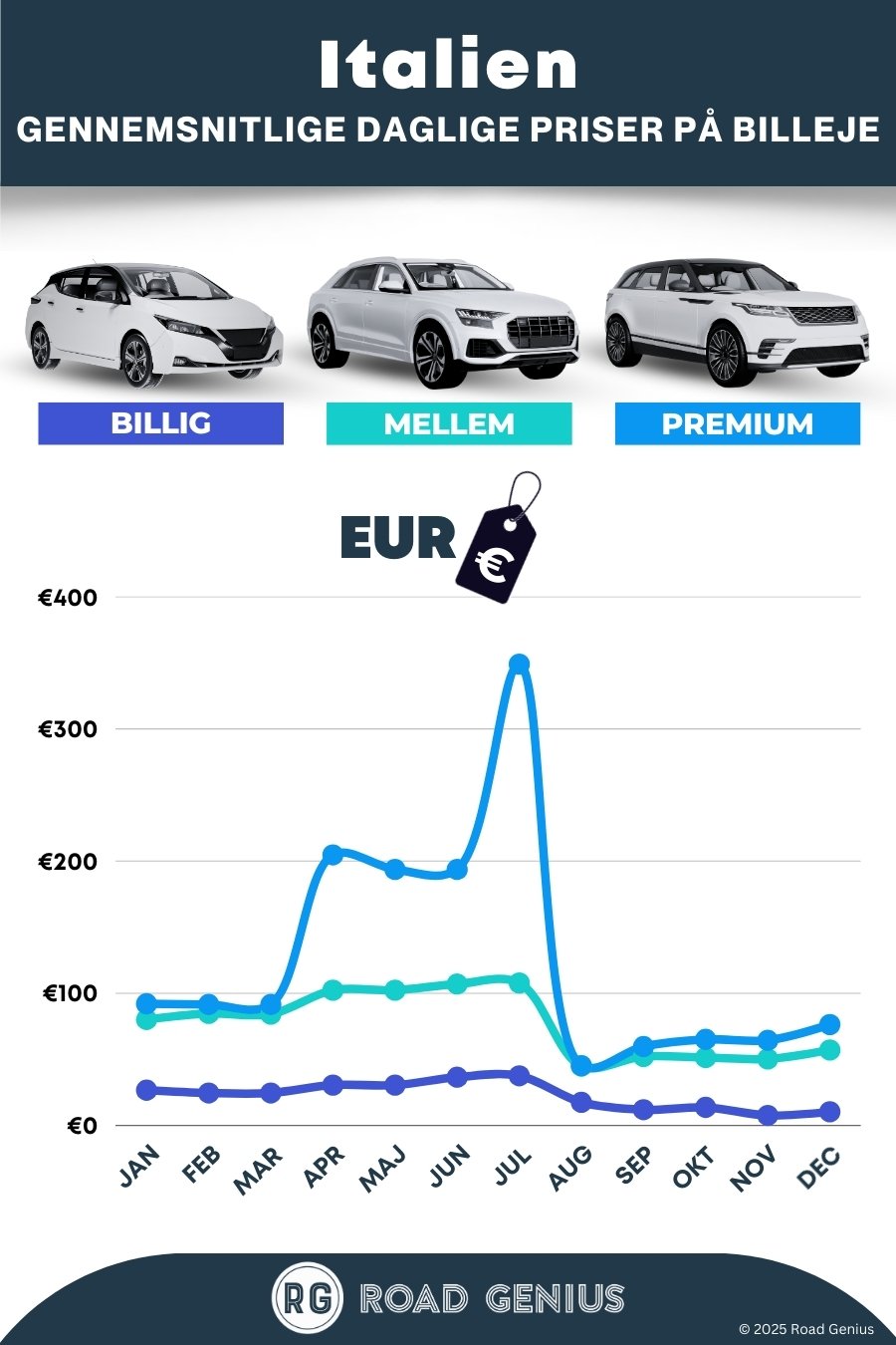 I gennemsnit koster billeje i Italien omkring 76 € pr. dag, og de billigste lejebiler fås fra 8 € pr. dag.