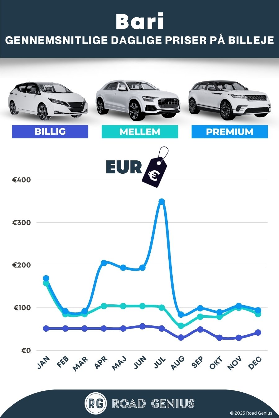 I gennemsnit koster billeje i Bari omkring 96 € pr. dag, og de billigste lejebiler fås fra 29 € pr. dag.