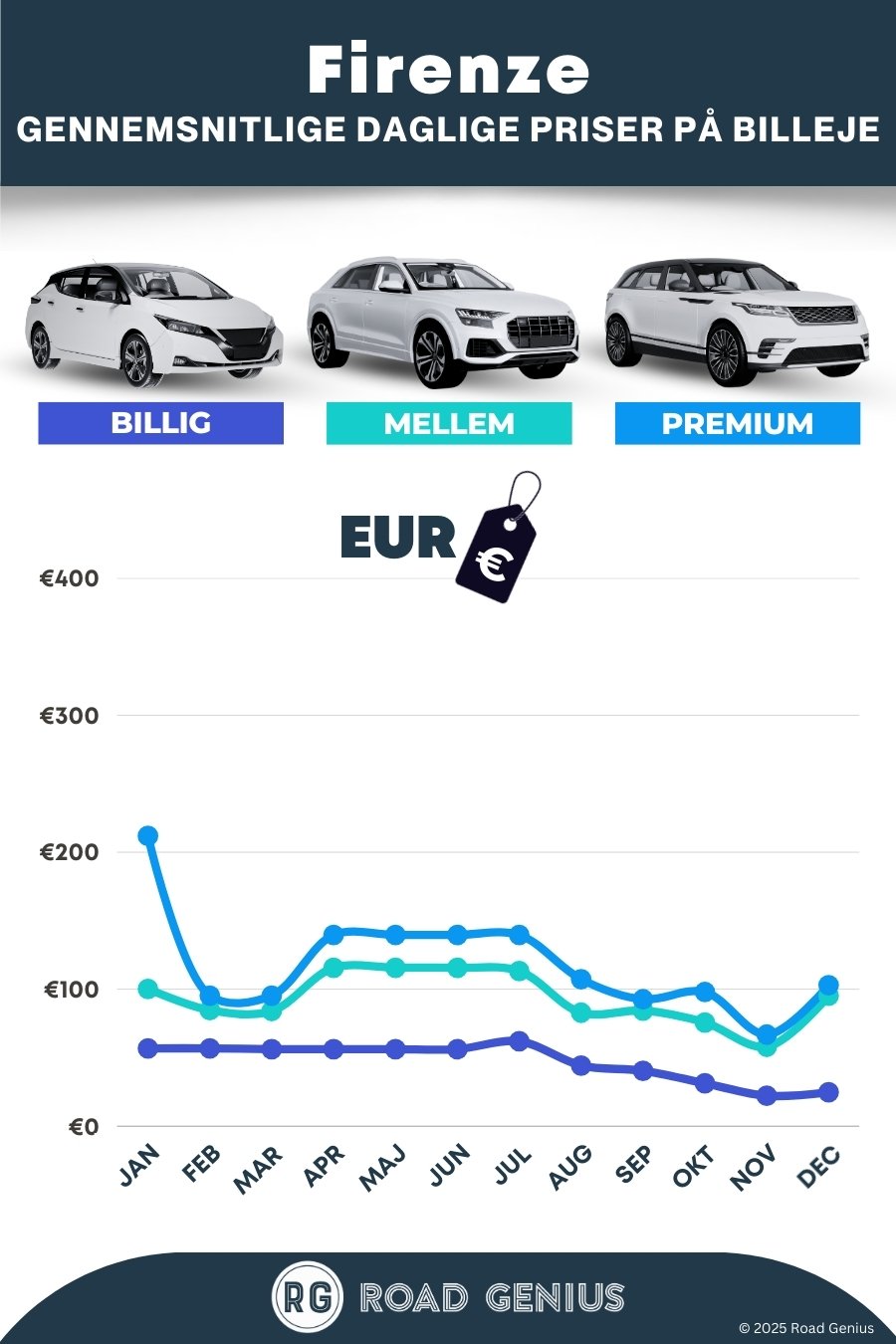 I gennemsnit koster billeje i Firenze omkring 87 € pr. dag, og de billigste lejebiler fås fra 22 € pr. dag.