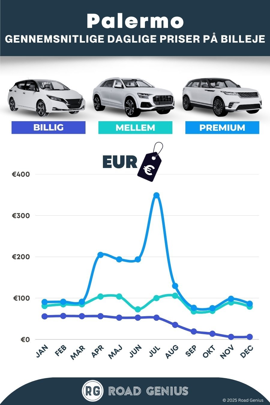 I gennemsnit koster billeje i Palermo omkring 88 € pr. dag, og de billigste lejebiler fås fra 6 € pr. dag.