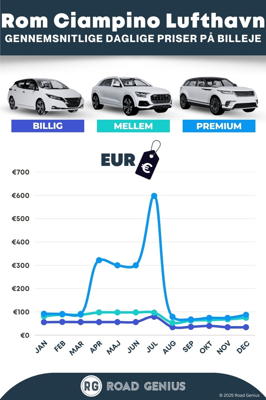I gennemsnit koster billeje i Rom Ciampino Airport omkring 104 € pr. dag, og de billigste lejebiler fås fra 34 € pr. dag.
