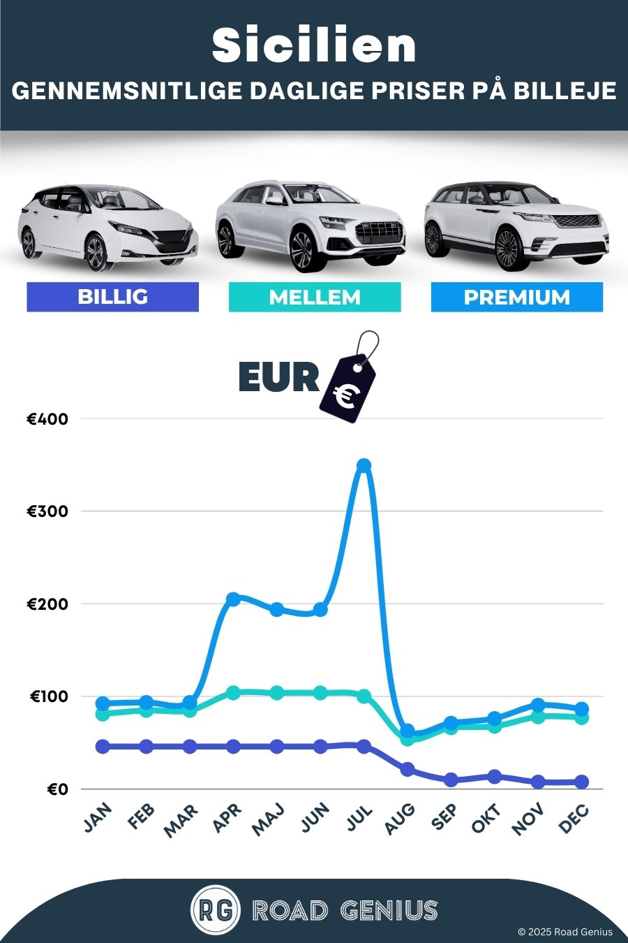 I gennemsnit koster billeje i Sicilien omkring 83 € pr. dag, og de billigste lejebiler fås fra 8 € pr. dag.