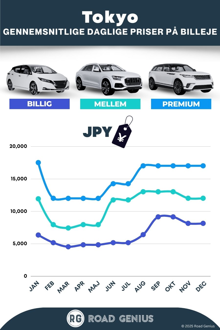 I gennemsnit koster billeje i Tokyo omkring 10.734 JPY pr. dag, og de billigste lejebiler fås fra 4.546 JPY pr. dag.