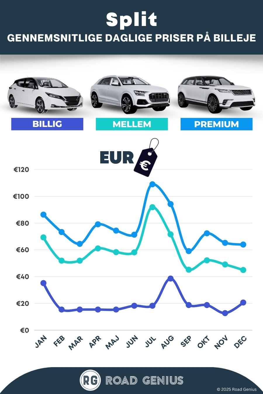 I gennemsnit koster billeje i Split omkring 52 € pr. dag, og de billigste lejebiler fås fra 13 € pr. dag.