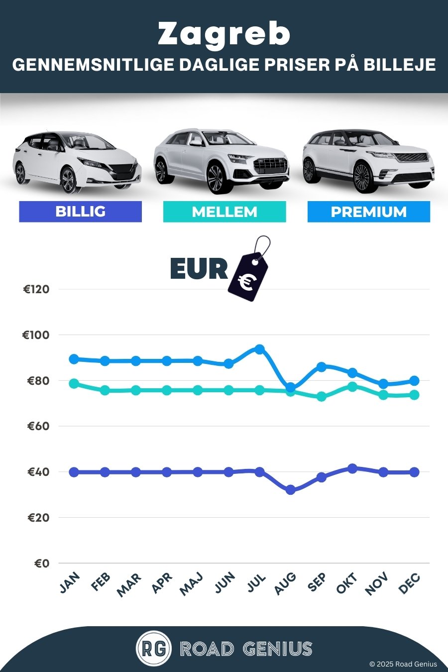 I gennemsnit koster billeje i Zagreb omkring 67 € pr. dag, og de billigste lejebiler fås fra 32 € pr. dag.