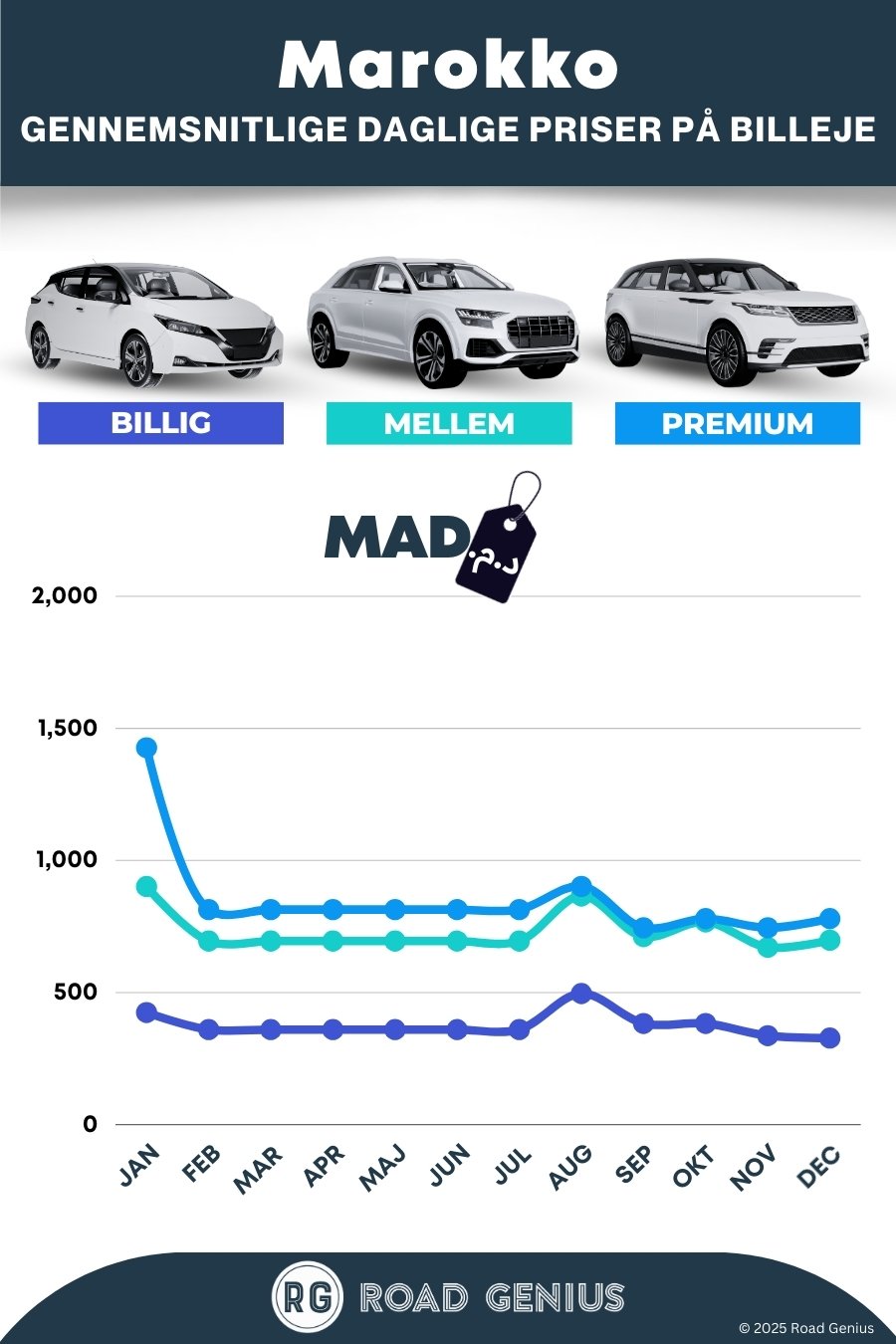 I gennemsnit koster billeje i Marokko omkring 654 MAD pr. dag, og de billigste lejebiler fås fra 328 MAD pr. dag.