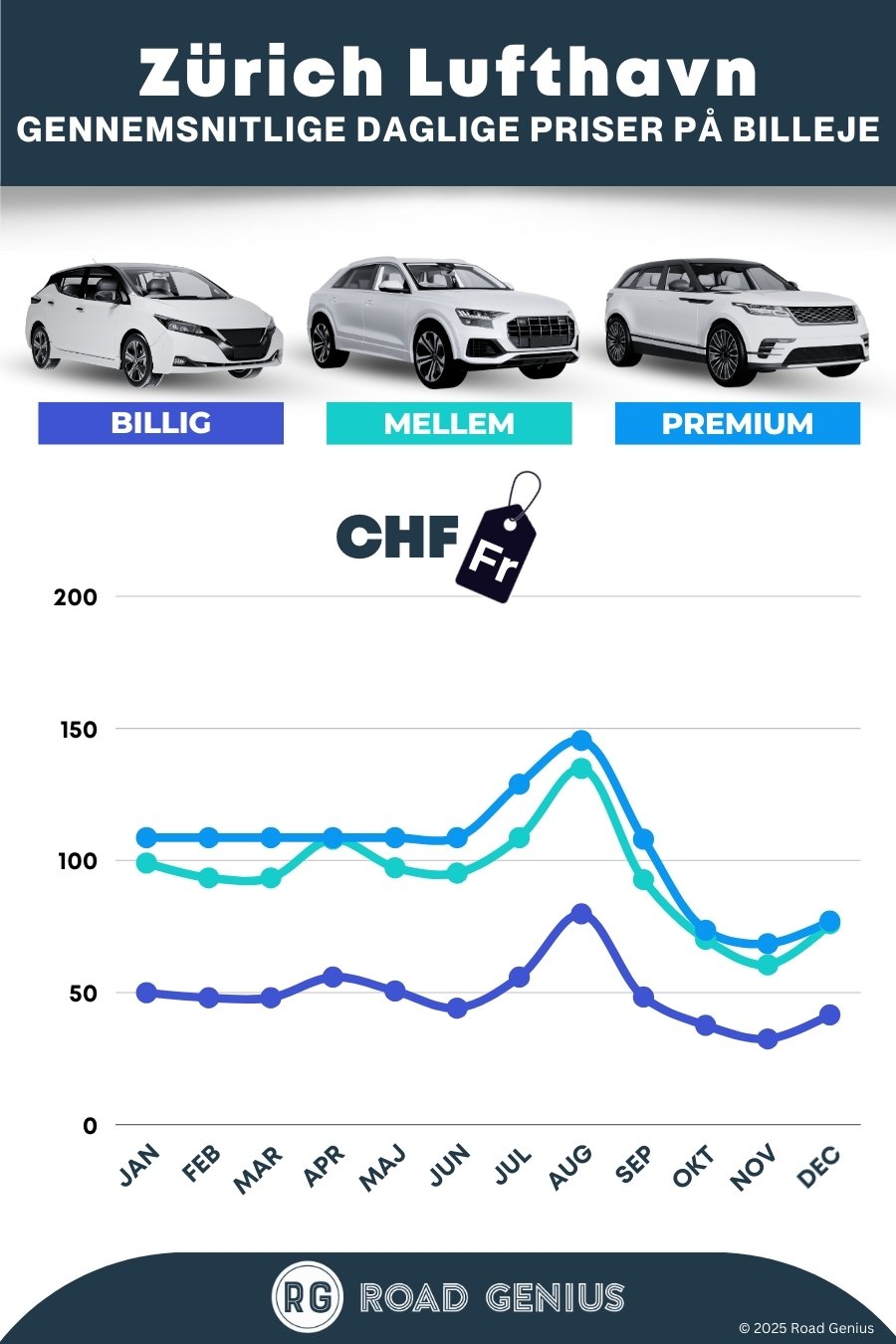 I gennemsnit koster billeje ved Zürich Airport omkring 76 CHF pr. dag, og de billigste lejebiler fås fra 25 CHF pr. dag.