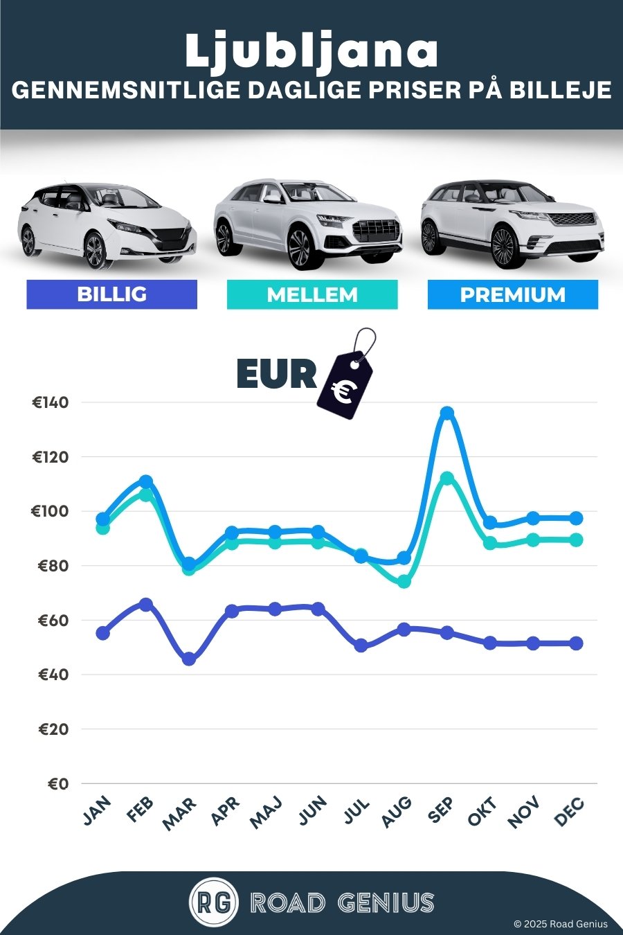 I gennemsnit koster billeje i Ljubljana omkring 81 € pr. dag, og de billigste lejebiler fås fra 46 € pr. dag.