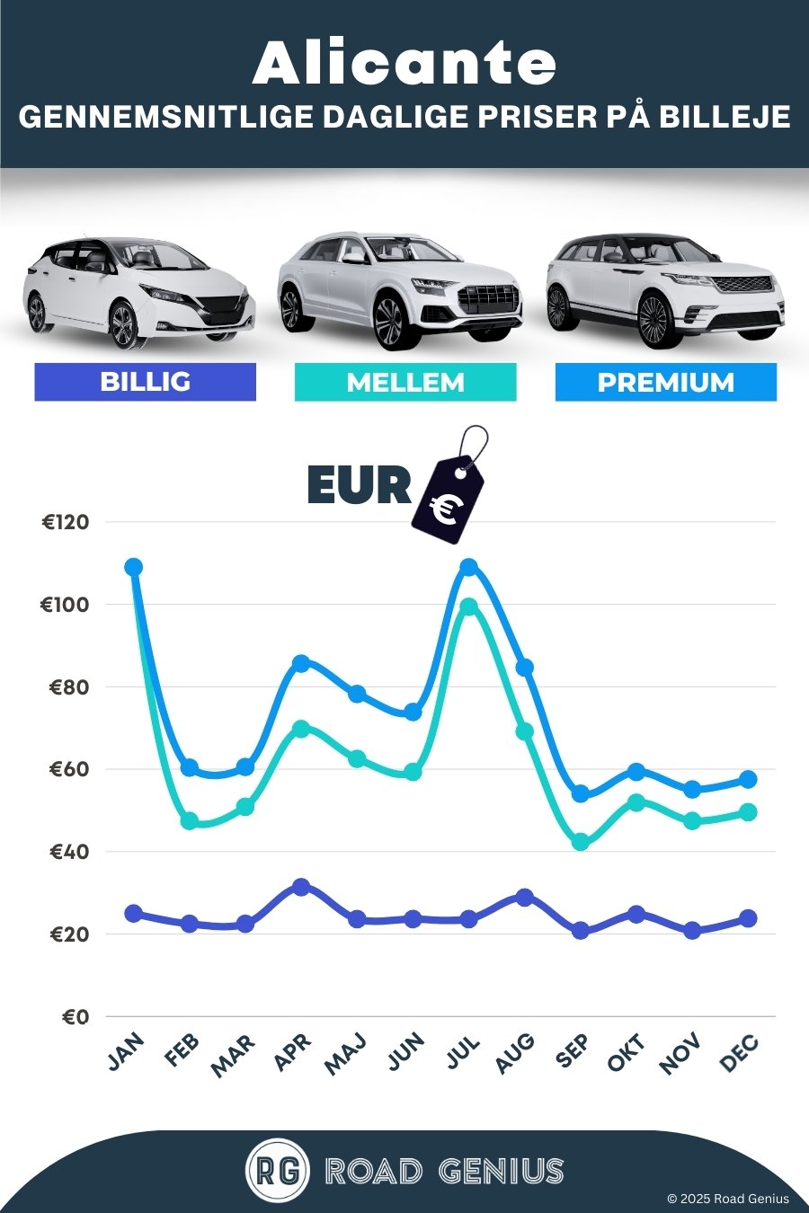 I gennemsnit koster billeje i Alicante omkring 54 € pr. dag, og de billigste lejebiler fås fra 21 € pr. dag.