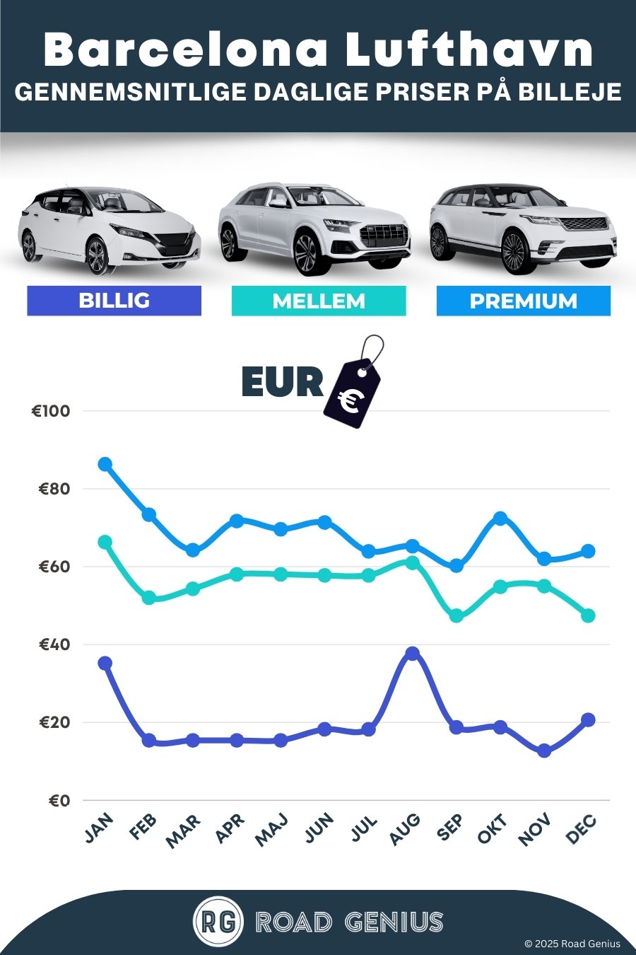 Med Road Genius kan du nemt sammenligne lejebiler fra de førende udbydere i Barcelona El Prat Lufthavn (BCN). Uanset om du leder efter en lille økonomibil, en stor SUV eller en minibus, finder du gode priser og praktiske afhentningssteder her. Du kan hente bilen direkte i Terminal 1 eller 2 eller tage en shuttlebus til et af udlejningskontorerne uden for lufthavnsområdet. Herfra er der let adgang til motorvejene C-31 og AP-7, der fører dig mod Barcelona by, Sitges, Tarragona og Costa Brava. Rejser du i højsæsonen? Så er det en god idé at booke i god tid og overveje at hente bilen uden for myldretiden for at undgå lange køer.