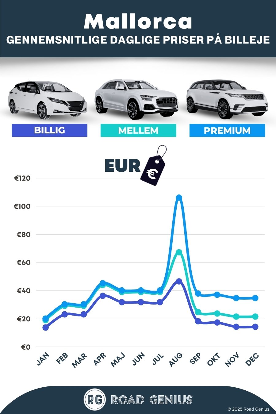 I gennemsnit koster billeje i Mallorca omkring 33 € pr. dag, og de billigste lejebiler fås fra 14 € pr. dag.
