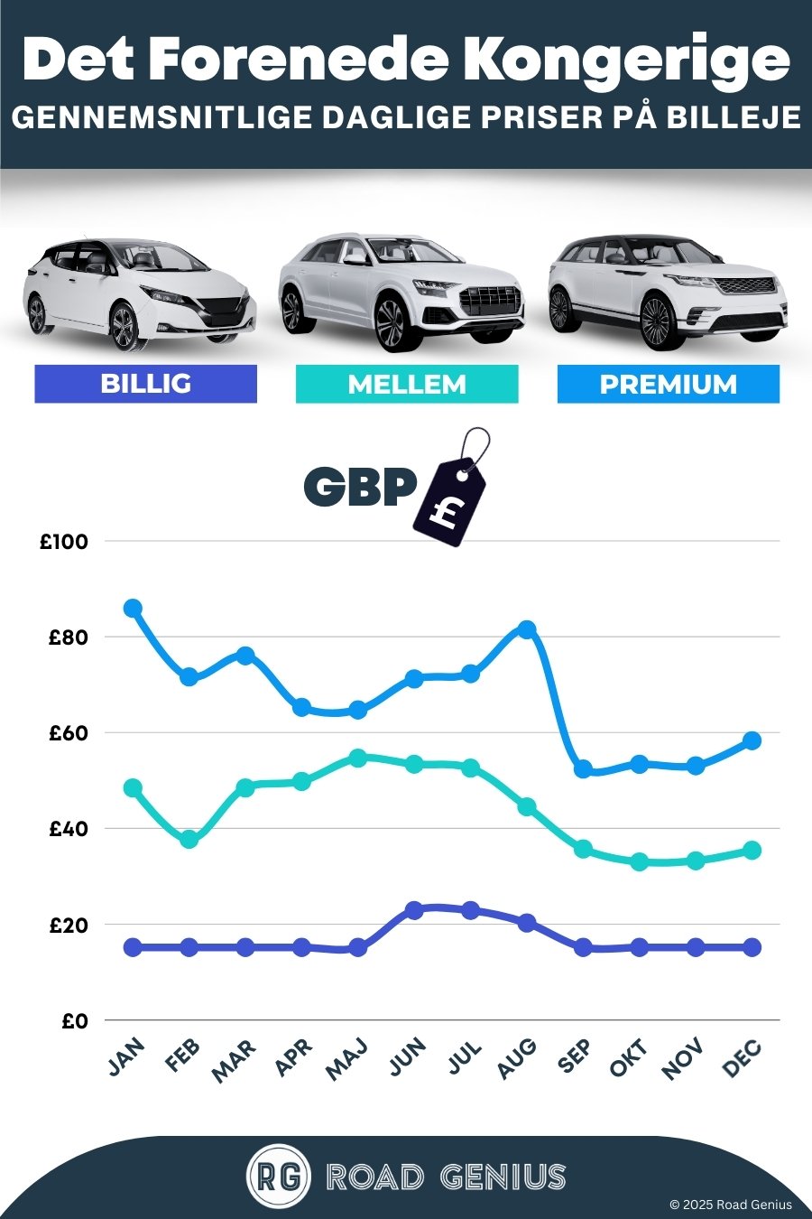 I gennemsnit koster billeje i Storbritannien omkring 43 € pr. dag, og de billigste lejebiler fås fra 15 € pr. dag.