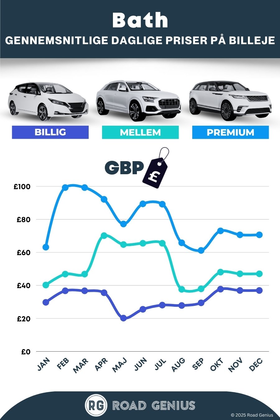 I gennemsnit koster billeje i Bath omkring 54 € pr. dag, og de billigste lejebiler fås fra 20 € pr. dag.