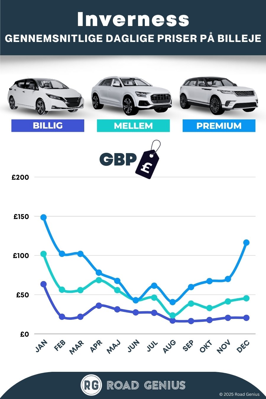 I gennemsnit koster billeje i Inverness omkring 52 € pr. dag, og de billigste lejebiler fås fra 16 € pr. dag.