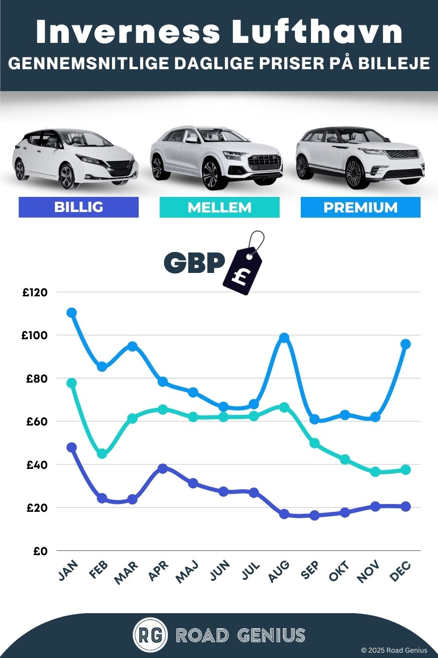 I gennemsnit koster billeje ved Inverness Airport omkring 54 € pr. dag, og de billigste lejebiler fås fra 16 € pr. dag.