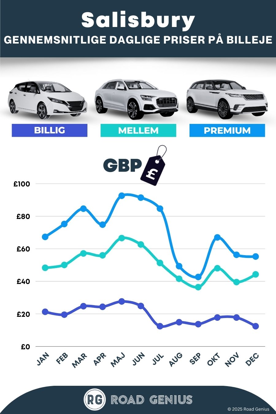 I gennemsnit koster billeje i Salisbury omkring 47 € pr. dag, og de billigste lejebiler fås fra 12 € pr. dag.