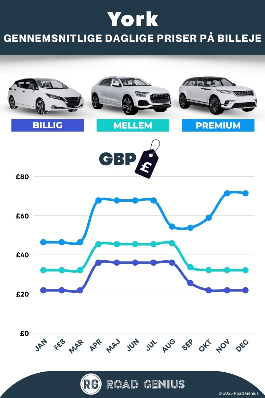 I gennemsnit koster billeje i York omkring 42 € pr. dag, og de billigste lejebiler fås fra 22 € pr. dag.