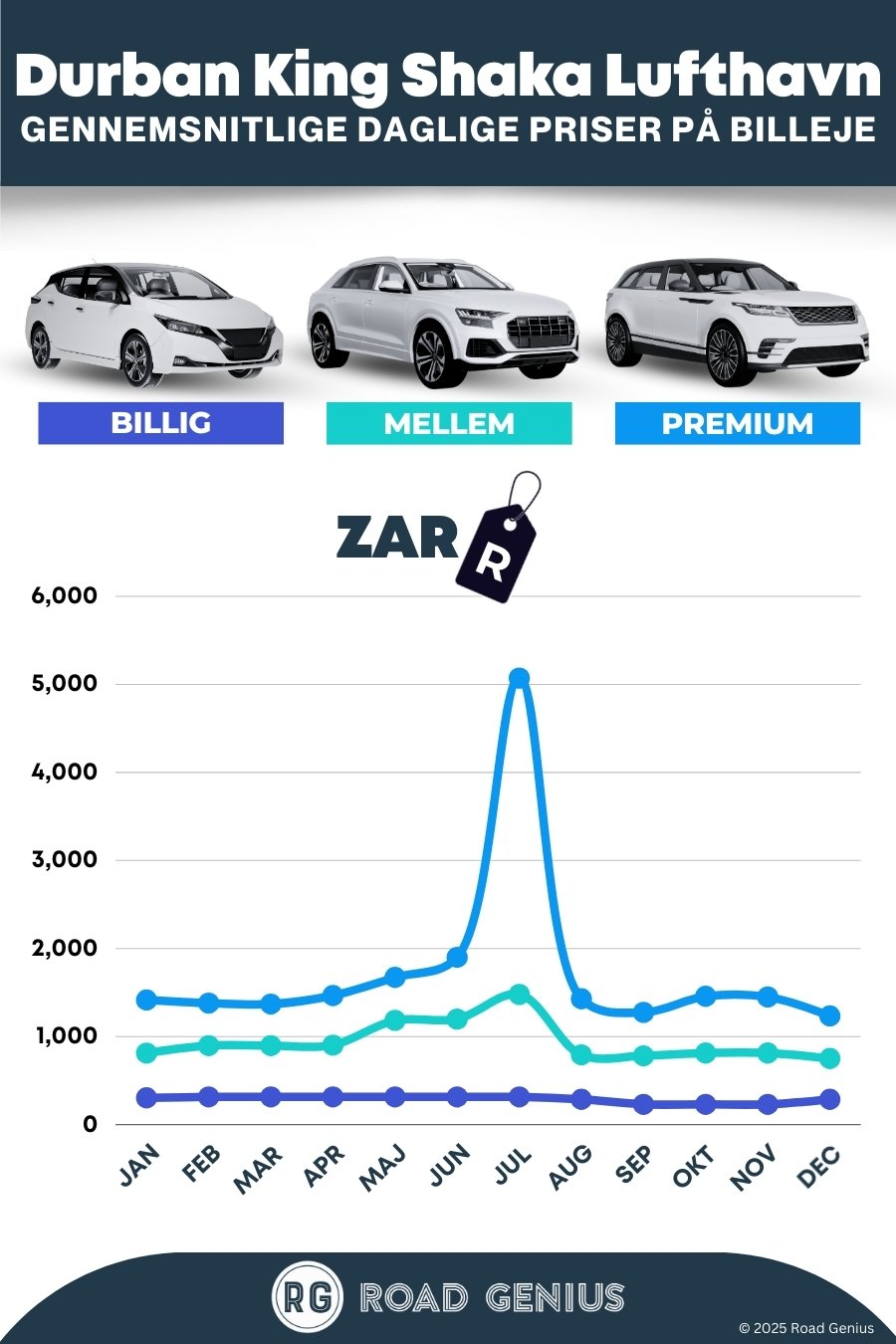 Sammenlign priser på billeje fra de førende udlejningsfirmaer i Durban lufthavn (DUR) med Road Genius. Uanset om du søger en lille økonomibil, en luksus-SUV eller en minibus (MPV), finder du skarpe priser og praktiske afhentningssteder. Hent din bil direkte i terminalen i King Shaka International Airport, kun en kort gåtur fra ankomsthallen, eller sammenlign priser for afhentning i Durban centrum eller Umhlanga for at undgå lufthavnsgebyrer. Book i god tid til højsæsonen i december–januar og omkring påske. Overvej at vælge fri kilometer, hvis du planlægger længere ture til f.eks. Drakensberg-bjergene, Hluhluwe-Imfolozi eller iSimangaliso.
