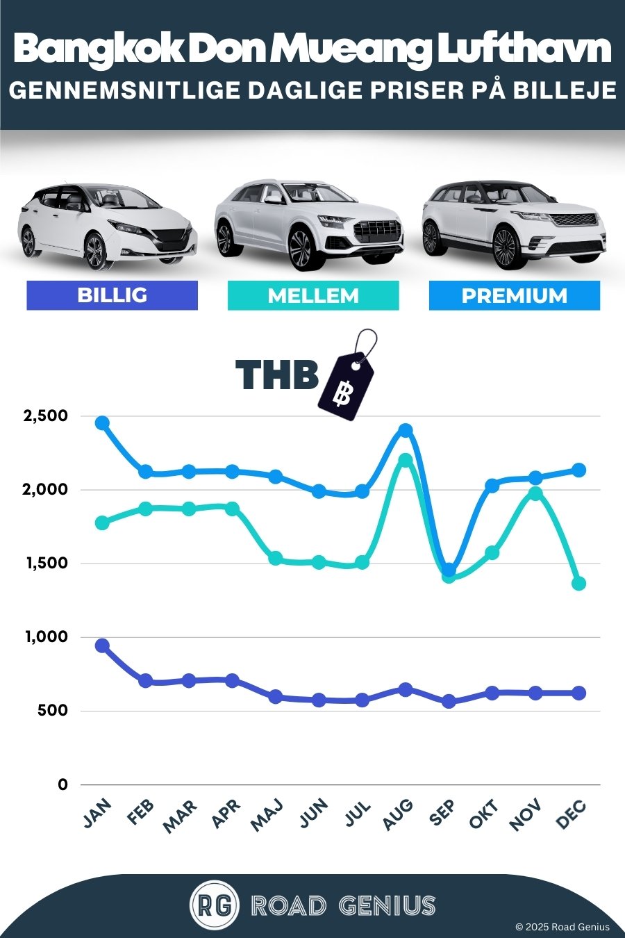 I gennemsnit koster billeje ved Bangkok Don Mueang Airport omkring 1.482 THB pr. dag, og de billigste lejebiler fås fra 566 THB pr. dag.