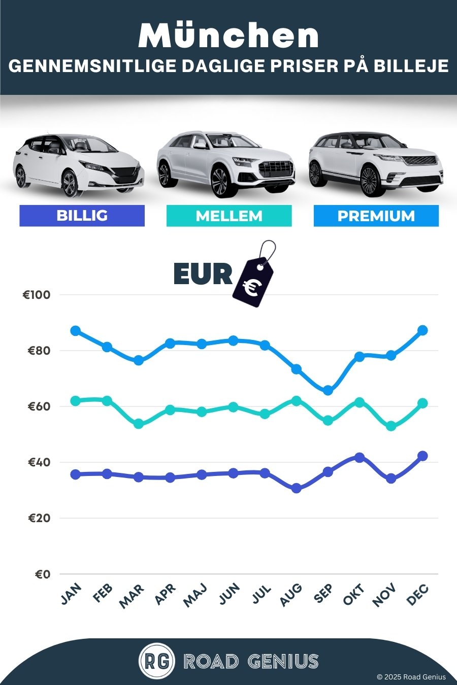 I gennemsnit koster billeje i München omkring 58 € pr. dag, og de billigste lejebiler fås fra 31 € pr. dag.
