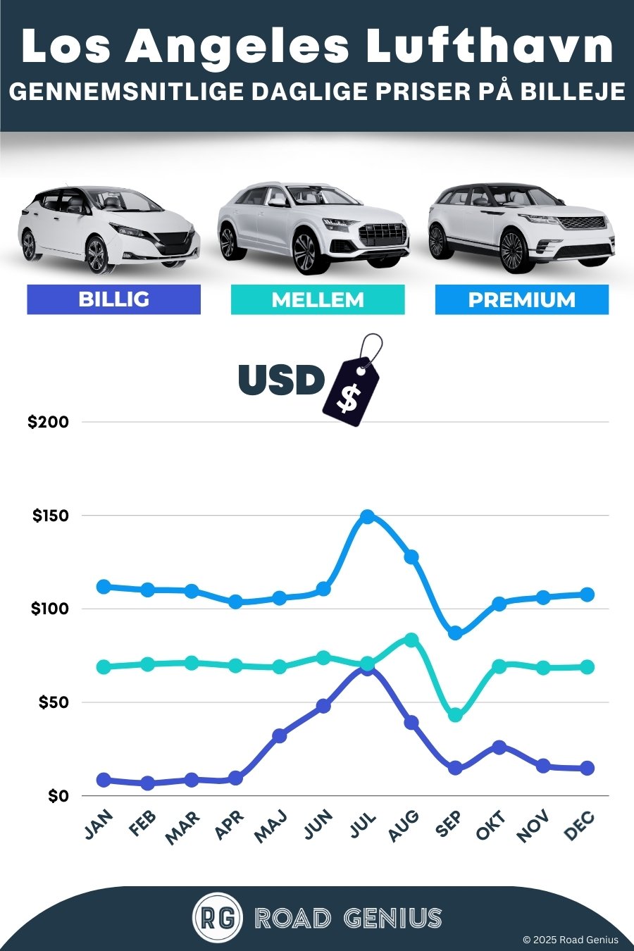 Med Road Genius er det nemt at finde en lejebil i Los Angeles Lufthavn (LAX). Sammenlign priser fra en lang række udlejningsfirmaer i hele USA – helt uden bookinggebyrer. Udlejningskontorerne ved LAX ligger et stykke fra terminalerne og kan nås med gratis shuttlebusser. De fleste firmaer har døgnåbent. Book i god tid for at undgå ventetid i travle perioder, og overvej et udlejningskontor uden for lufthavnen – det kan betyde lavere priser og hurtigere afhentning.
